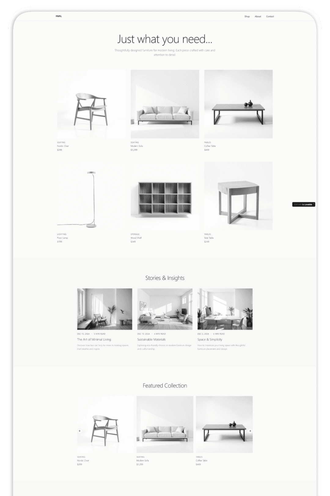 A minimalistic furniture store website with a calm vibe and colorful animations that bring the simple design to life.