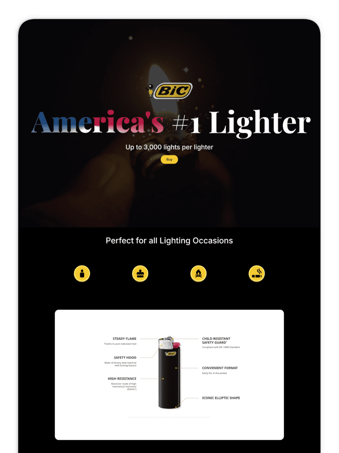 A website, showcasing the classic BIC lighter with smooth animations and interactive details.