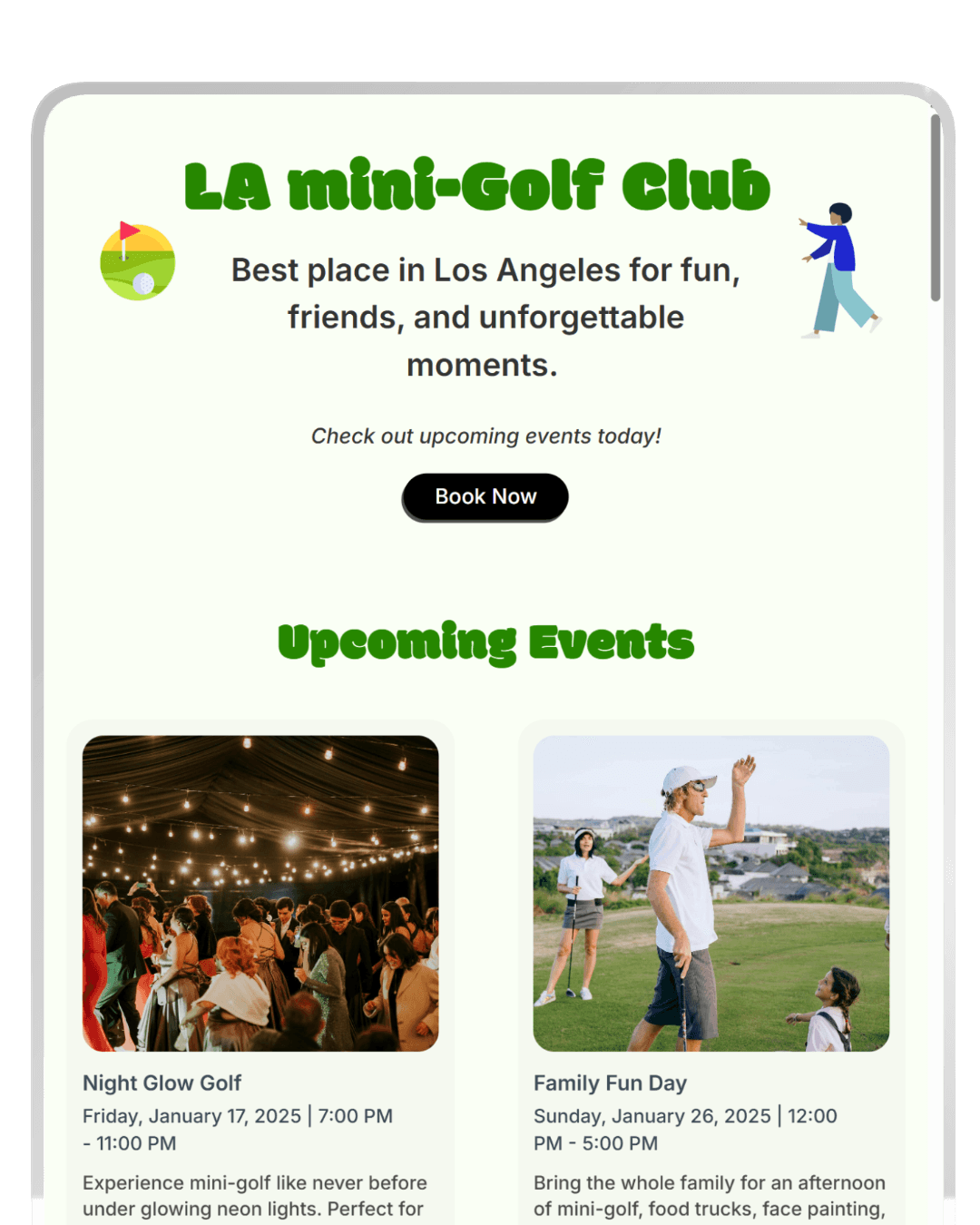 A fun, playful website with large typography and vibrant visuals for a small mini golf club.